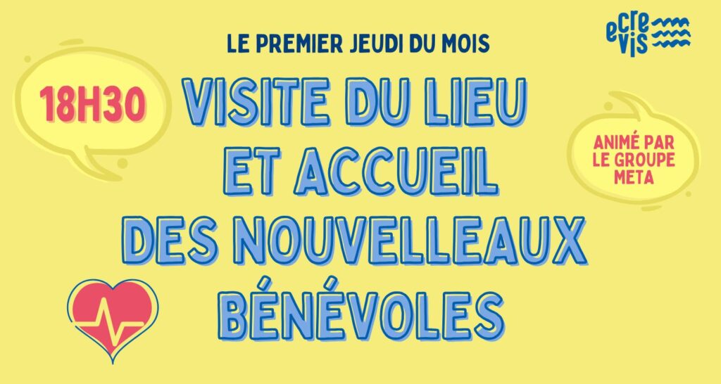 Vous pouvez venir le premier jeudi de chaque mois à l’ECREVIS, à 18h30 et vous serez accueilli.es par le groupe META qui vous fera visiter le lieu suivi d’une explication de l’organisation du lieu et son fonctionnement.